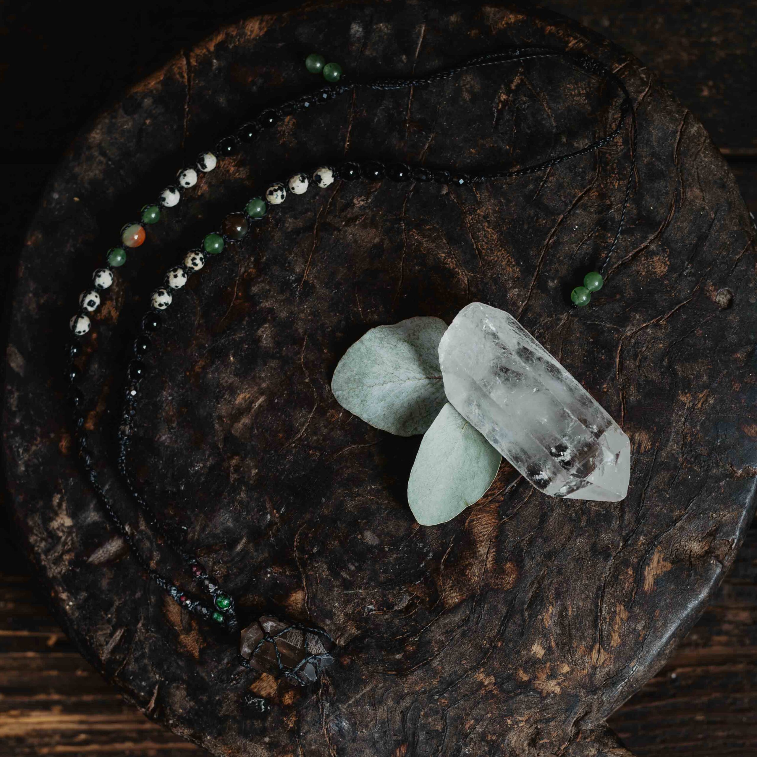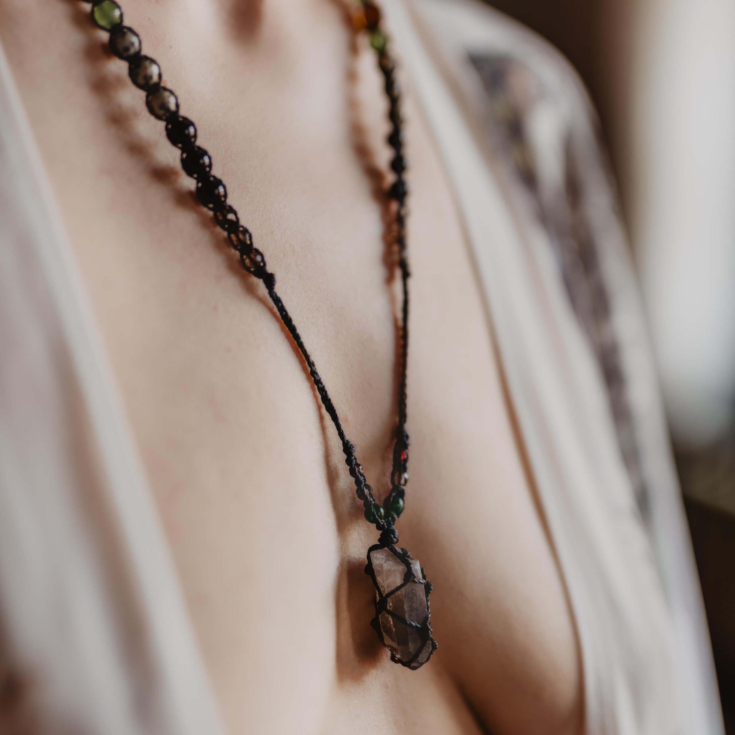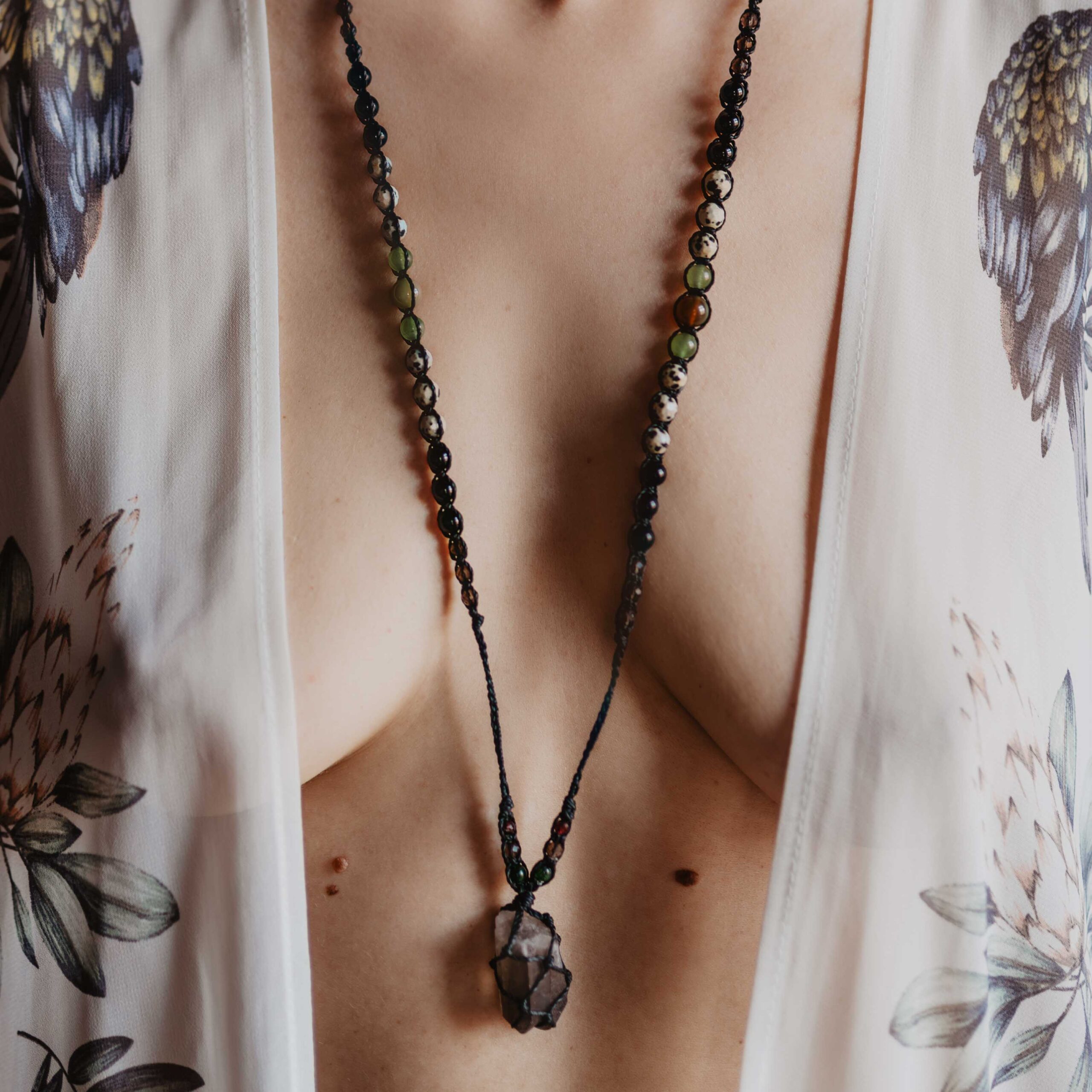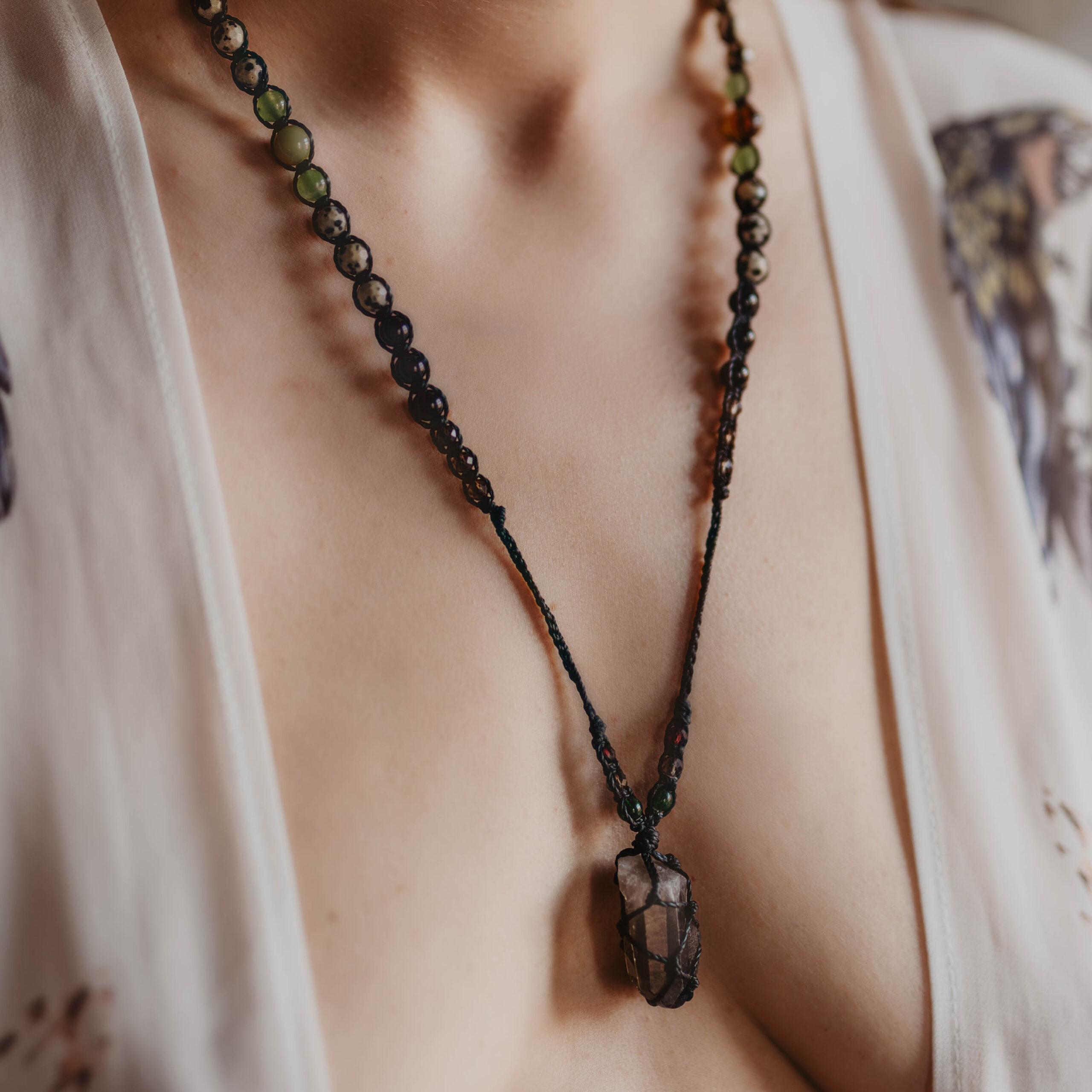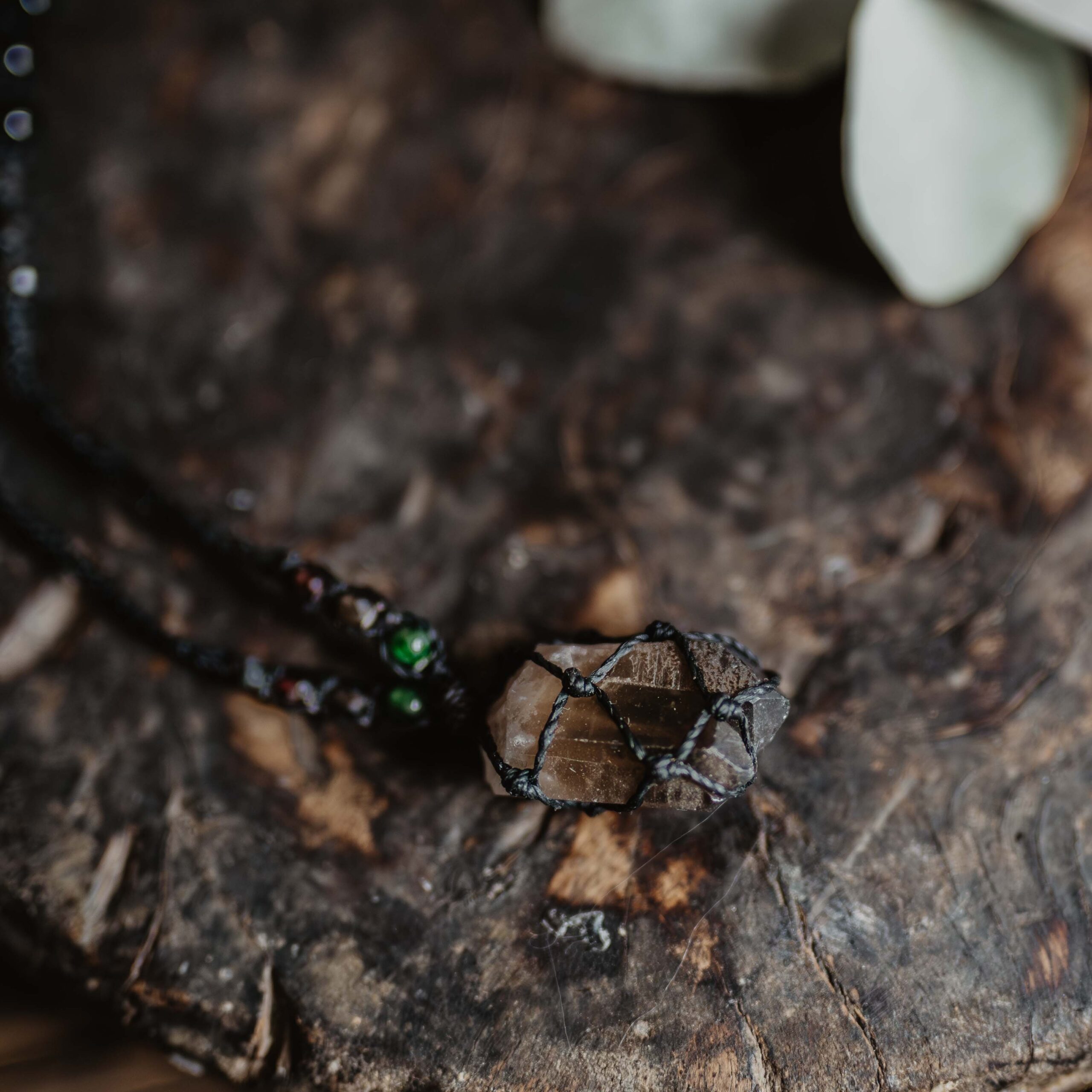 Kwarc Dymny jest kamieniem głębokiego uziemienia, transformacji i subtelnej mocy przemiany; symbolem tego, co ukryte, a jednocześnie przejrzyste wewnątrz cienia. Jego dymny odcień przypomina półcienie między światłem a ciemnością, jak mgła, która porusza się między sferami widzialnego i niewidzialnego, niesiona wymiarem pradawnej mądrości Ziemi i pierwotnej alchemii. Kwarc dymny działa jak strażnik równowagi między materią a duchem, osadzając świadomość w ciele i umyśle, a jednocześnie pozwalając dotknąć tego, co często pozostaje poza granicami zwykłego postrzegania- transmutując napięcia i ciężary w wewnętrzną klarowność i siłę stabilności. W intencji z archetypem Hekate, boginią magii, rytuałów i tajemnych ścieżek, kwarc dymny staje się kluczem do pełni świadomości, wewnętrznej mocy i starożytnych kodów wiedzy. Jako kamień uziemienia, łączy w sobie przeciwieństwa. Jego energia prowadzi przez procesy inicjacyjne i rytualne przemiany, pomagając odpamiętać to, co zanurzone w głębszych warstwach świadomości i zintegrować starożytną mądrość z Tu i Teraz. Kwarc dymny przypomina, że pełnia jako synchronia męskiego i żeńskiego, ducha i materii, jest możliwa wtedy, gdy światło i cień spotykają się w jedności, a tajemne klucze wiedzy odsłaniają się temu, kto odważy się wejść w rytuał przemiany.