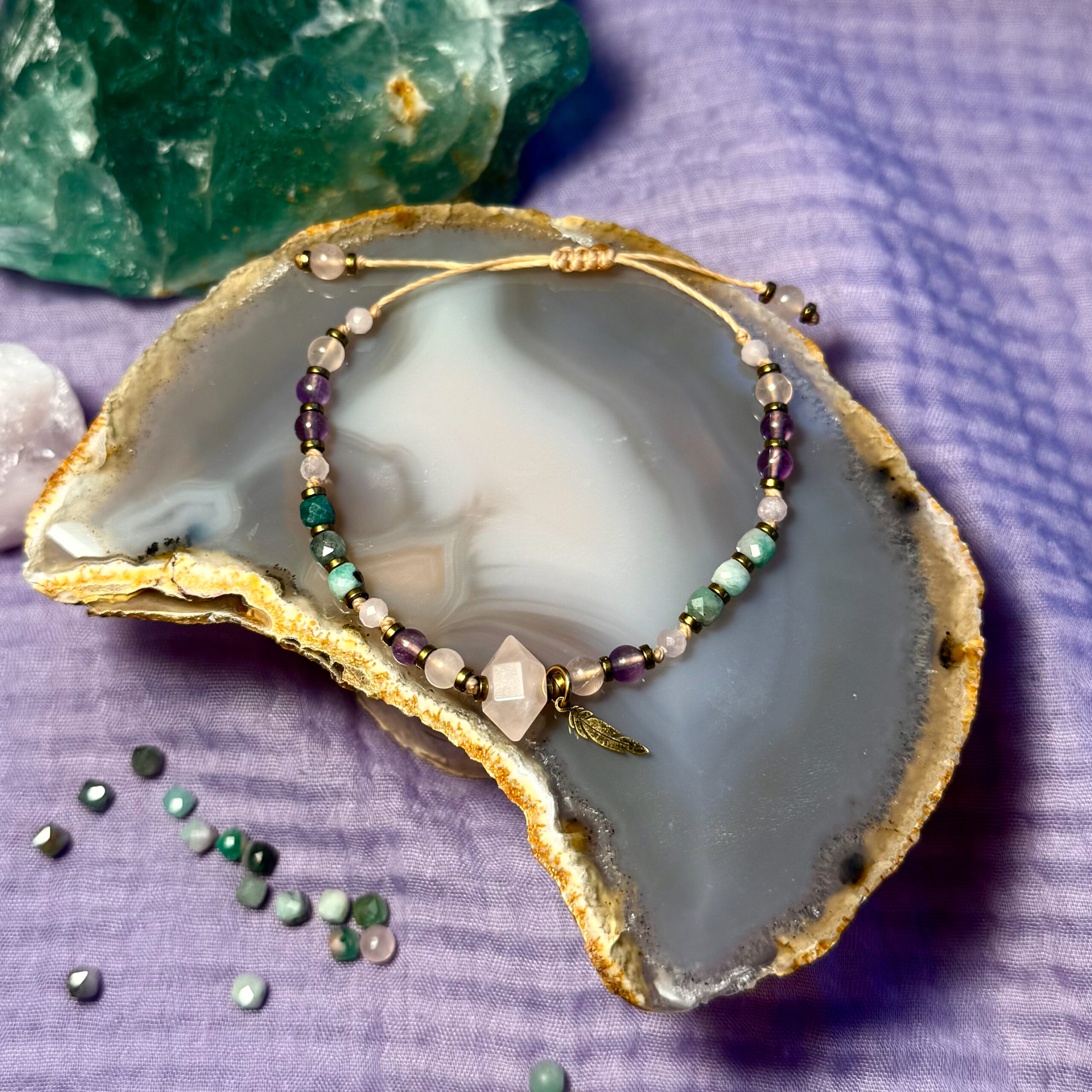 Towarzyszą mu szmaragd, kunzyt, ametyst, kwarc różowy, hematyt oraz zawieszka piórka jako symbolu lekkości i otwarcia się na przekazy duchowych przewodników.